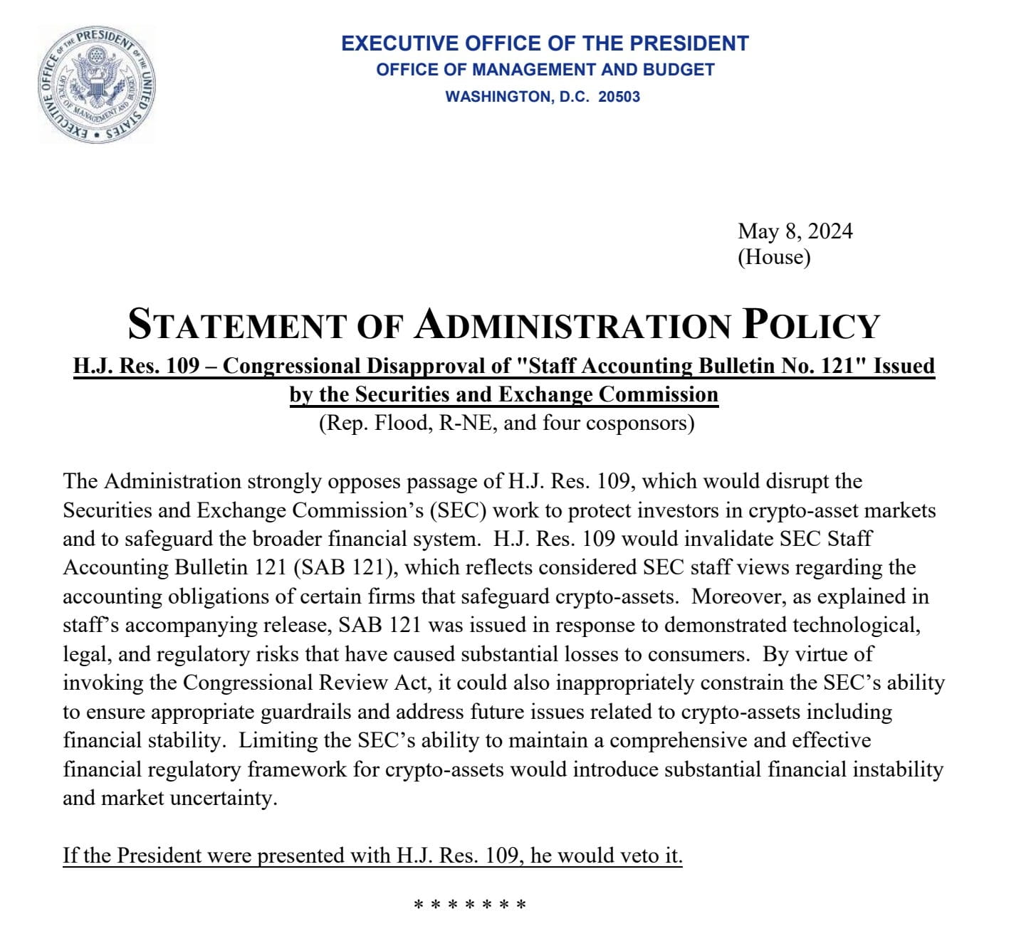 Executive Office of US President Joe Biden Announce Its position on the proposed legislation, HJ Res. 109, would allow highly regulated financial companies to act as custodians for bitcoin and other cryptocurrencies. JUST IN: ?? US President Joe Biden’s administration says Biden will veto legislation that would allow highly regulated…